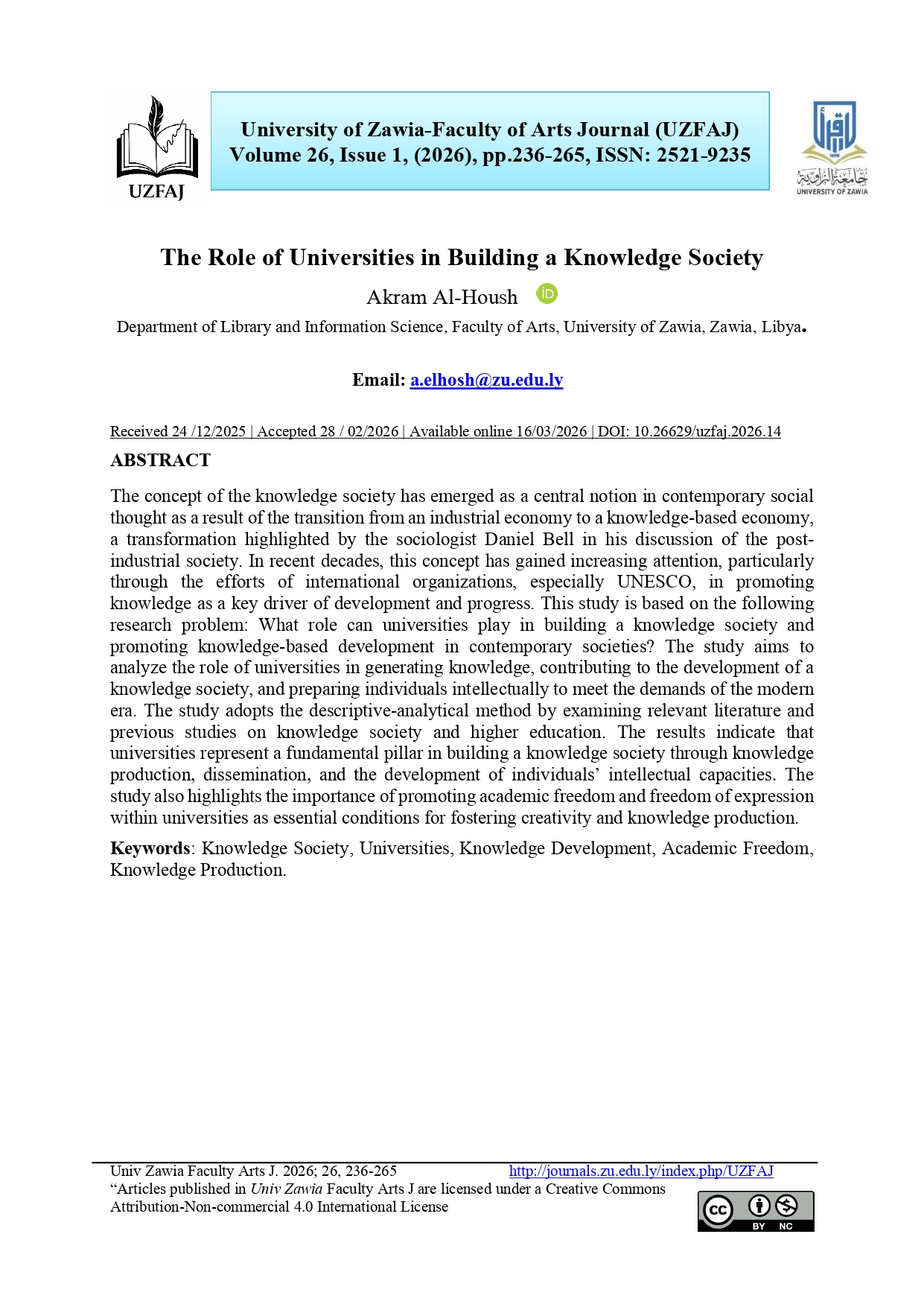الهوش أ. (2026). دور الجامعات في بناء مجتمع المعرفة. جامعة الزاوية - مجلة كلية الآداب, 26(1), 236–265. https://doi.org/10.26629/uzfaj.2026.14