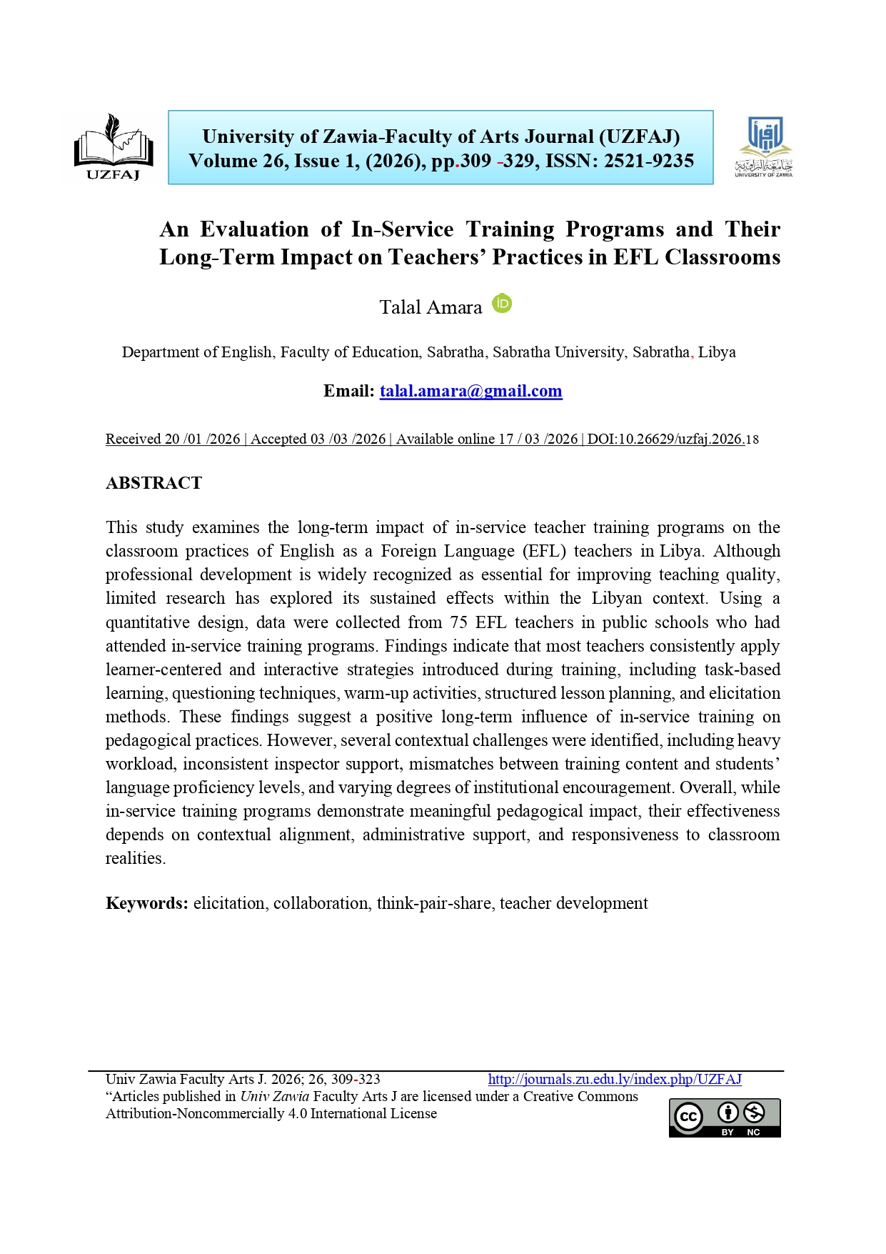 عمارة ط. (2026). تقييم برامج التدريب أثناء الخدمة وأثرها طويل الأمد على ممارسات المعلمين في صفوف اللغة الإنجليزية كلغة أجنبية. جامعة الزاوية - مجلة كلية الآداب, 26(1), 314–334. https://doi.org/10.26629/uzfaj.2026.18
