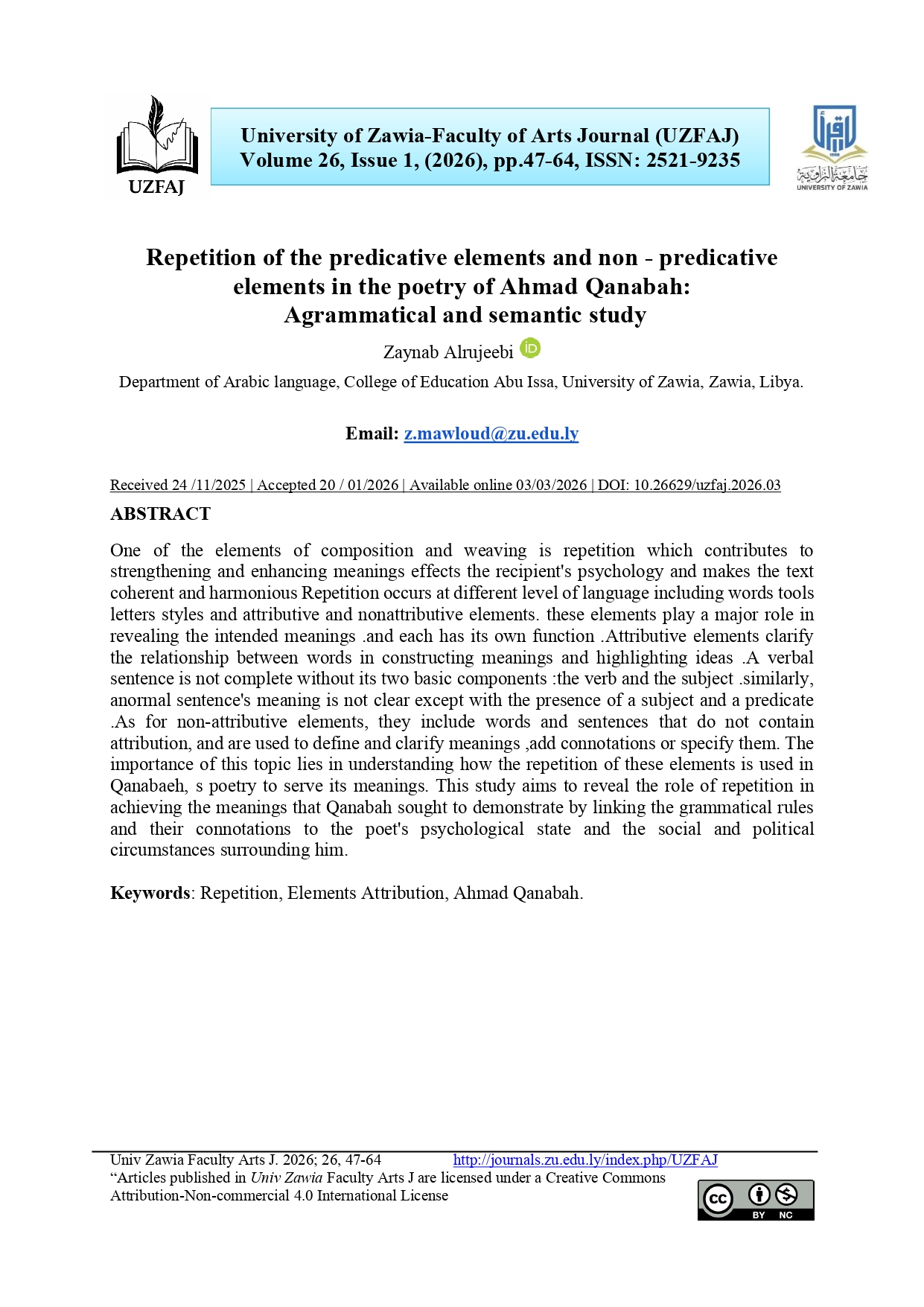 تكرار العناصر الإسنادية والعناصر غير الإسنادية في شعر أحمد قنابة: دراسة نحوية دلالية