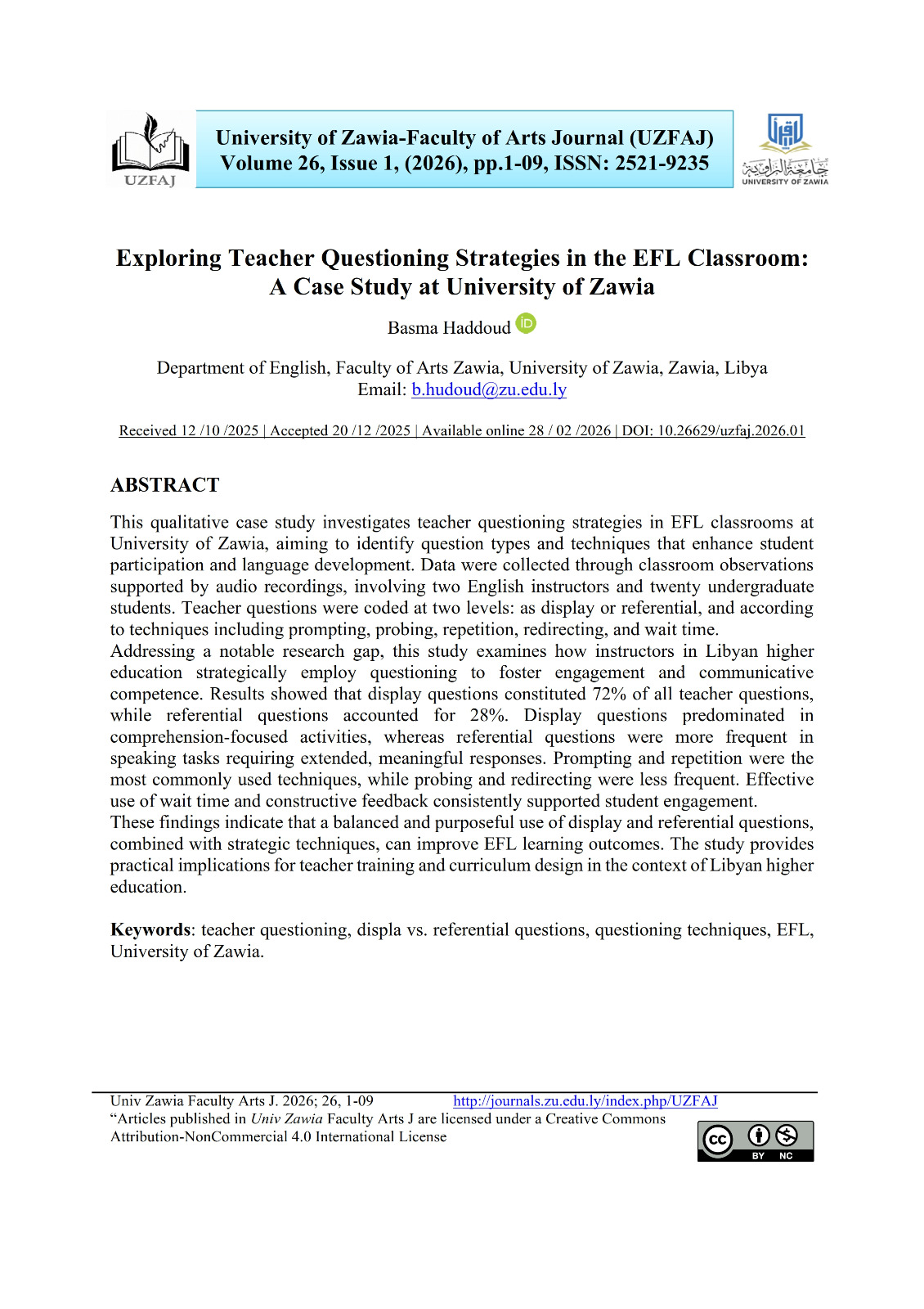 Exploring Teacher Questioning Strategies in the EFL Classroom: A Case Study at University of Zawia